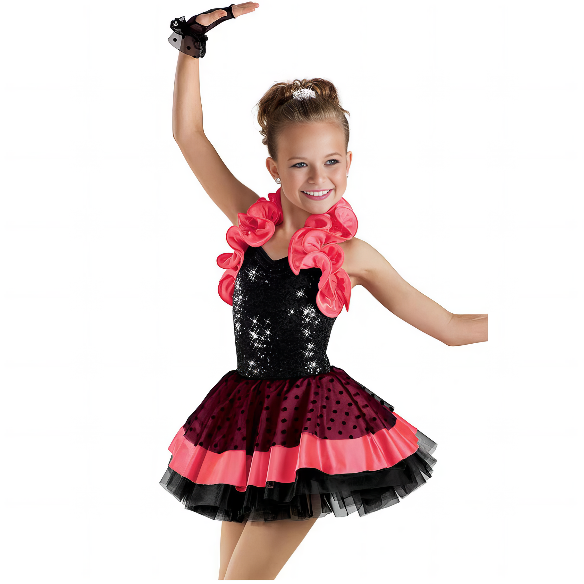 Préparez-vous à rebondir, virevolter et scintiller avec le costume de danse Happy Dots , un ensemble dynamique conçu pour faire tourner les têtes et apporter de la joie ! Avec son imprimé à pois audacieux, ses bretelles dos nu jaunes accrocheuses et son éclat de tulle arc-en-ciel, ce costume est parfait pour le jazz, les claquettes et les numéros de groupe entraînants.