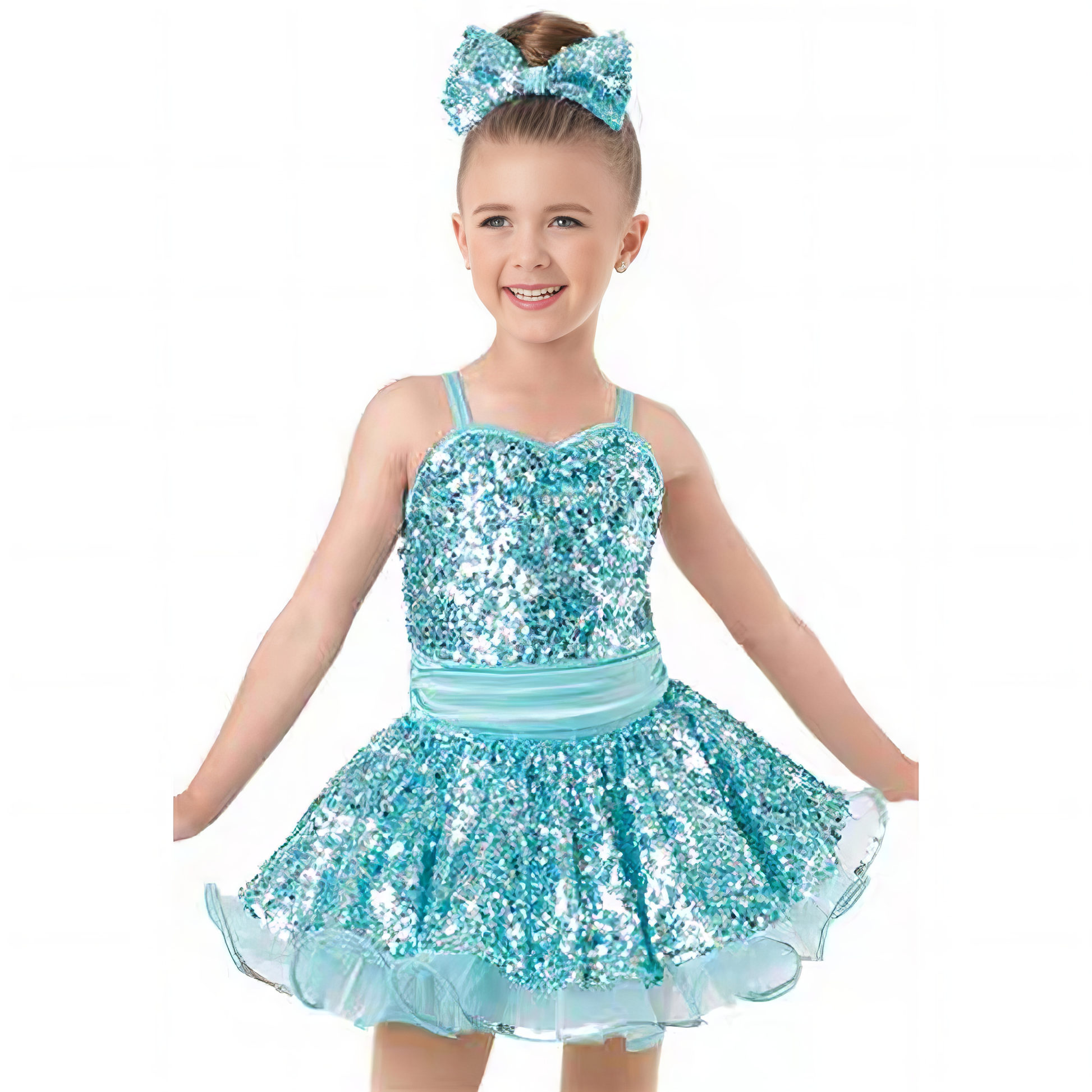 Shine bright on stage with Aqua Star, a stunning costume made for young dancers who love to sparkle! This all-over sequin design captures the light from every angle, with delicate aqua spaghetti straps and a matching satin waistband that accentuates the silhouette. The layered sequin skirt twirls effortlessly, while the oversized matching bow hairpiece completes the dazzling look.