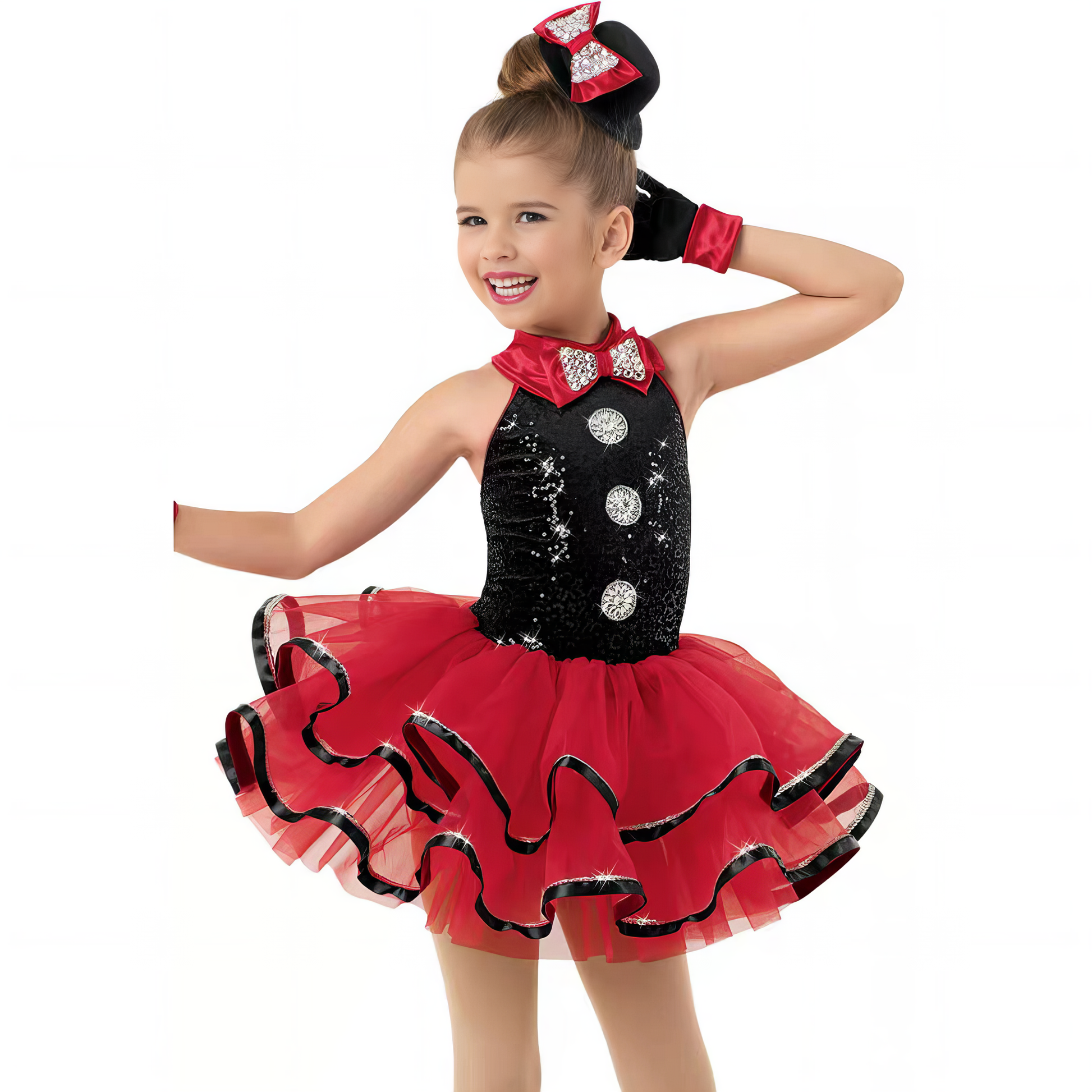 Finished with a statement bow tie, matching gloves and mini top hat, this look is made for the stage — perfect for tap, jazz or character routines with attitude and polish.