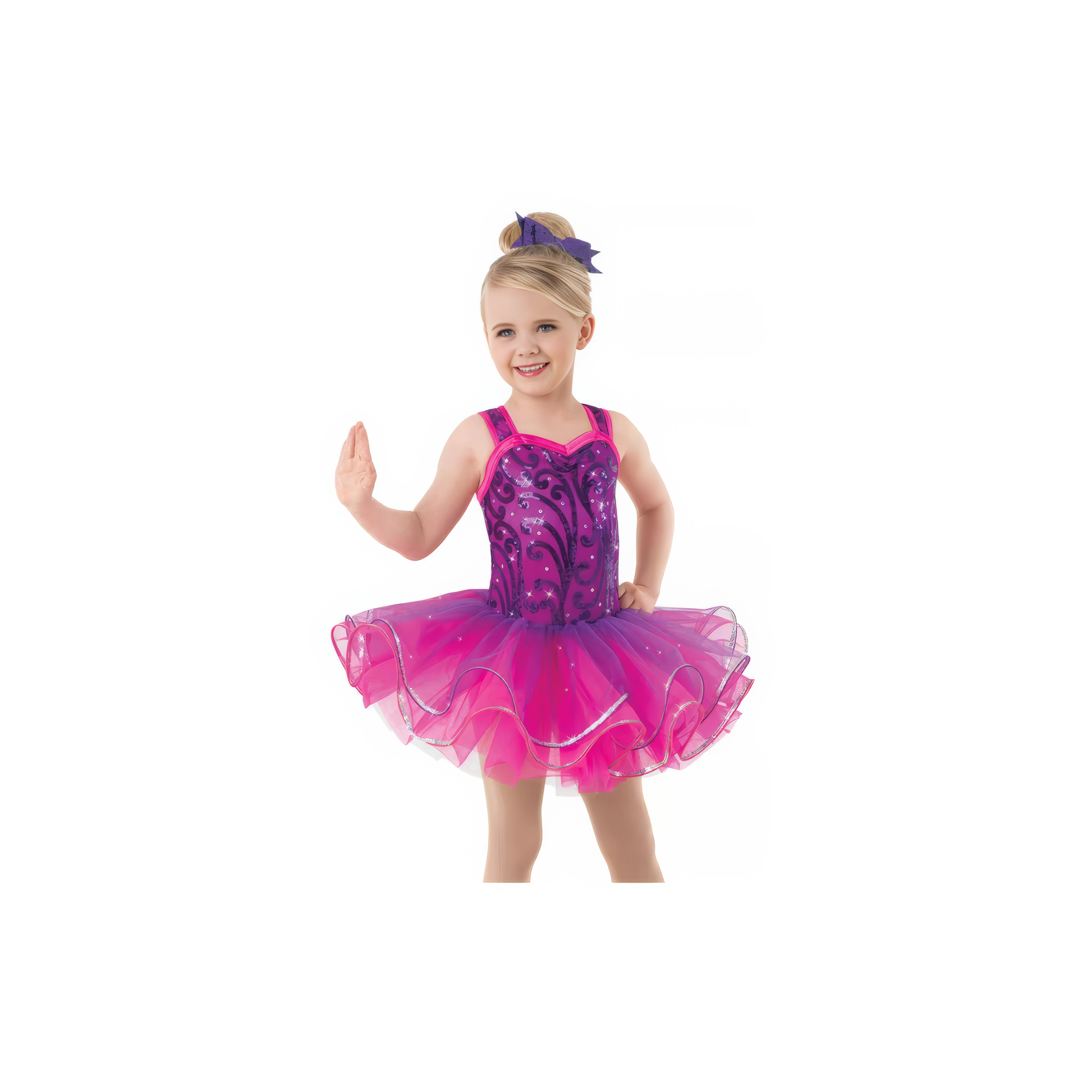Bright, bold and beautifully twirly — Fuchsia Fable is made for the little dancer who loves to shine. With a sparkling purple sequin bodice accented by hot pink trims and a voluminous layered tutu, this costume radiates energy and confidence on stage.