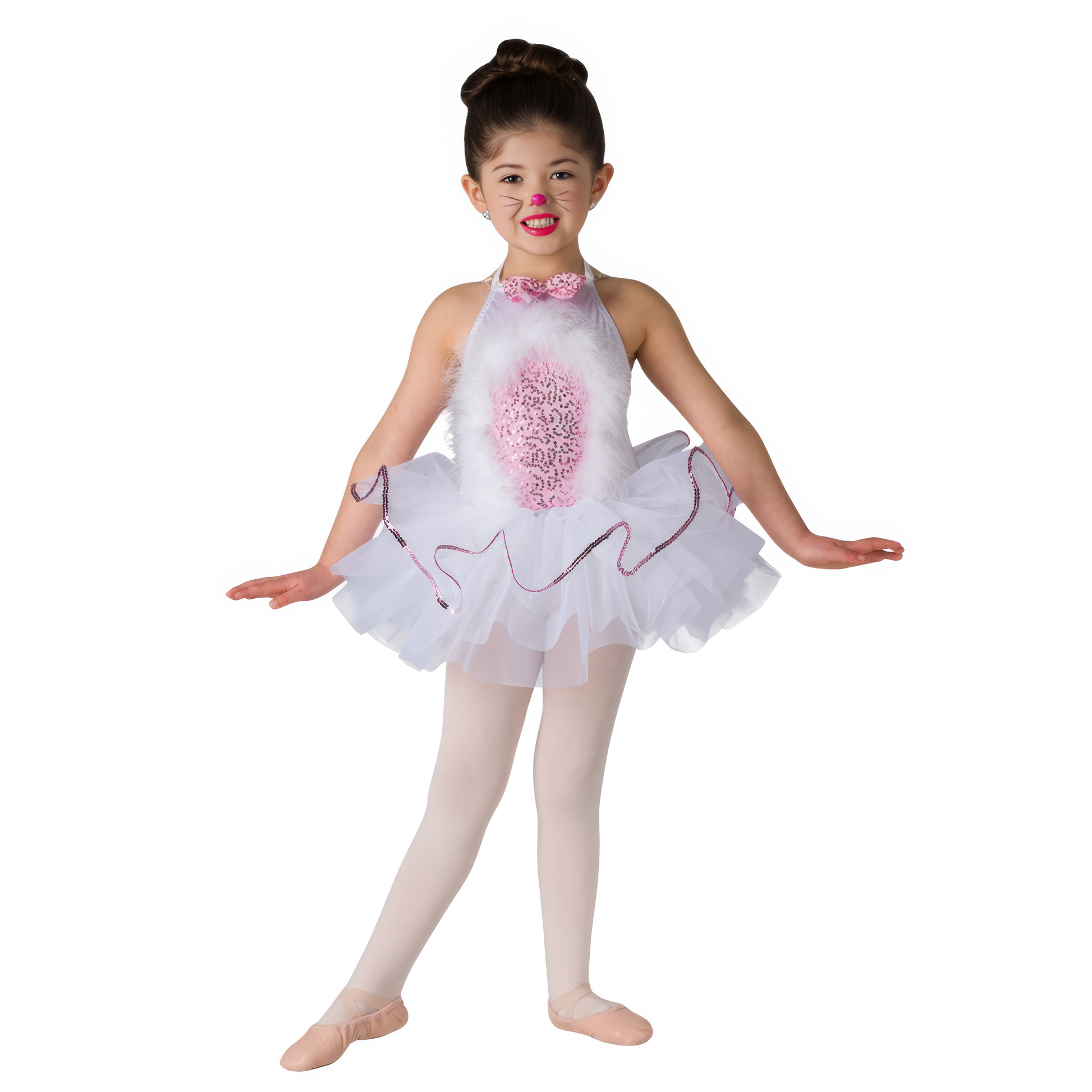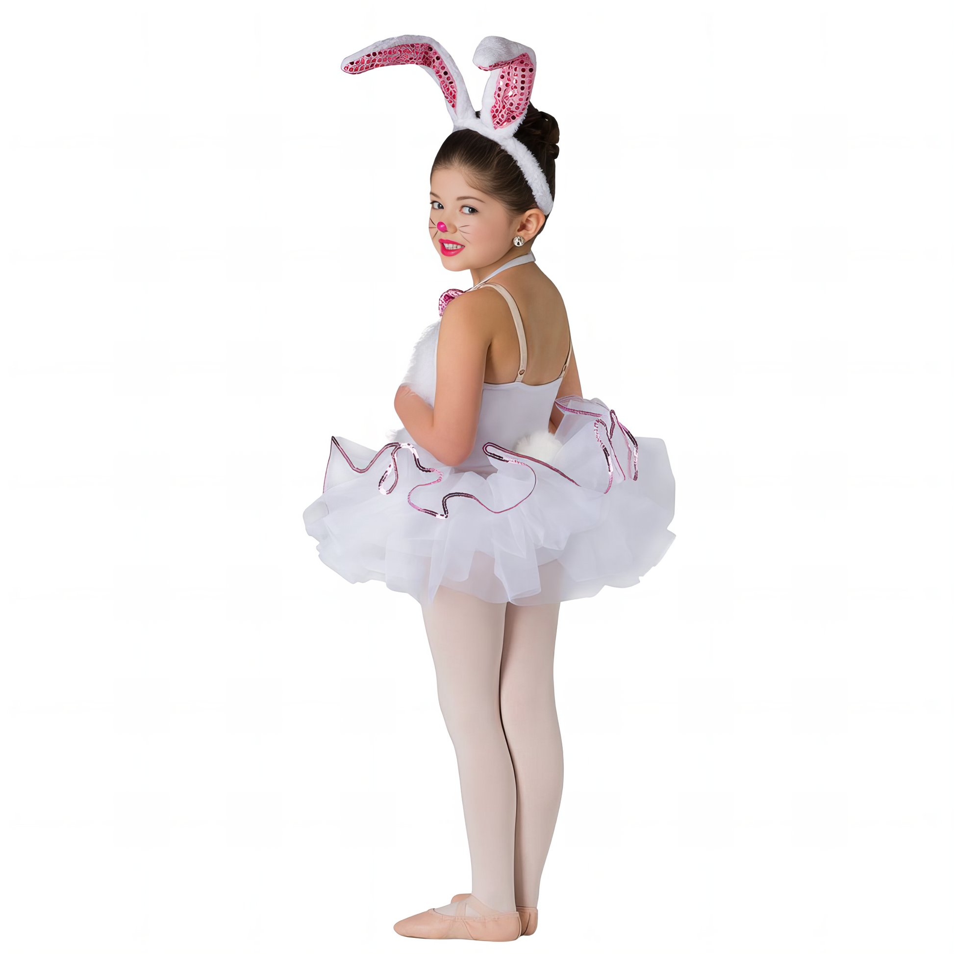 The Bunny Ballet costume is a pastel dream come true. With a pink sequin bodice, fluffy faux fur trim, and layers of crisp white tulle edged in sparkly pink, this bunny-inspired look is made to shine. The pink bowtie and built-in bunny tail make it perfect for whimsical routines, Easter themes, or tiny dancers hopping into their recital debut.