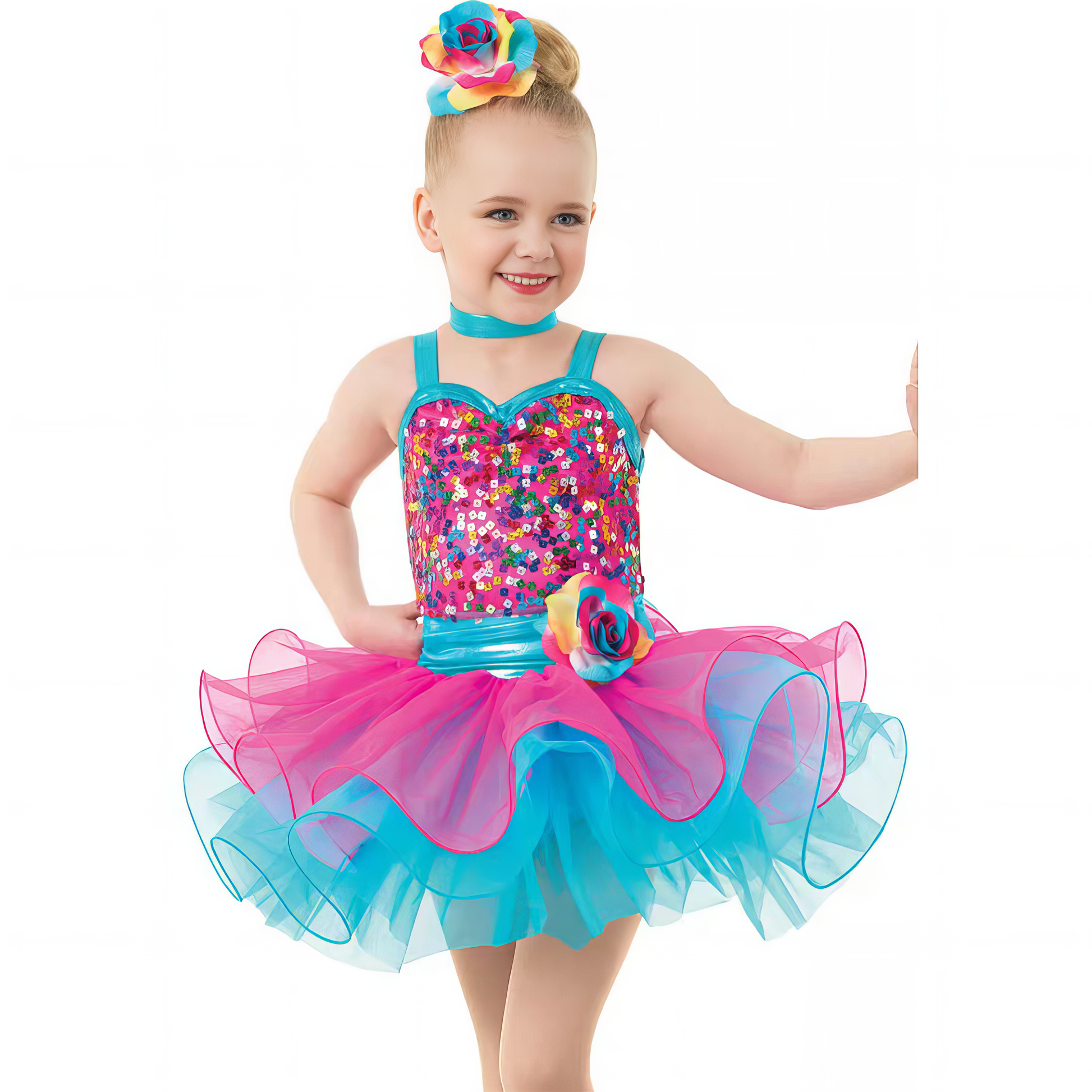 Colour, sparkle and pure joy — Bubblegum Bliss is a show-stopping costume for dancers who love to shine! The vibrant sequin bodice glimmers in every light, while layers of hot pink and turquoise tulle create a full, playful tutu silhouette. A satin waistband and matching floral details at the waist and hair add the perfect finishing touch.