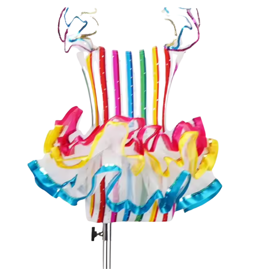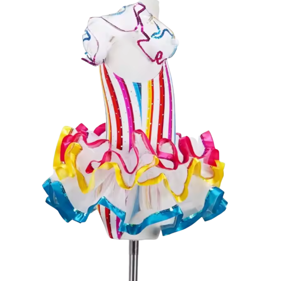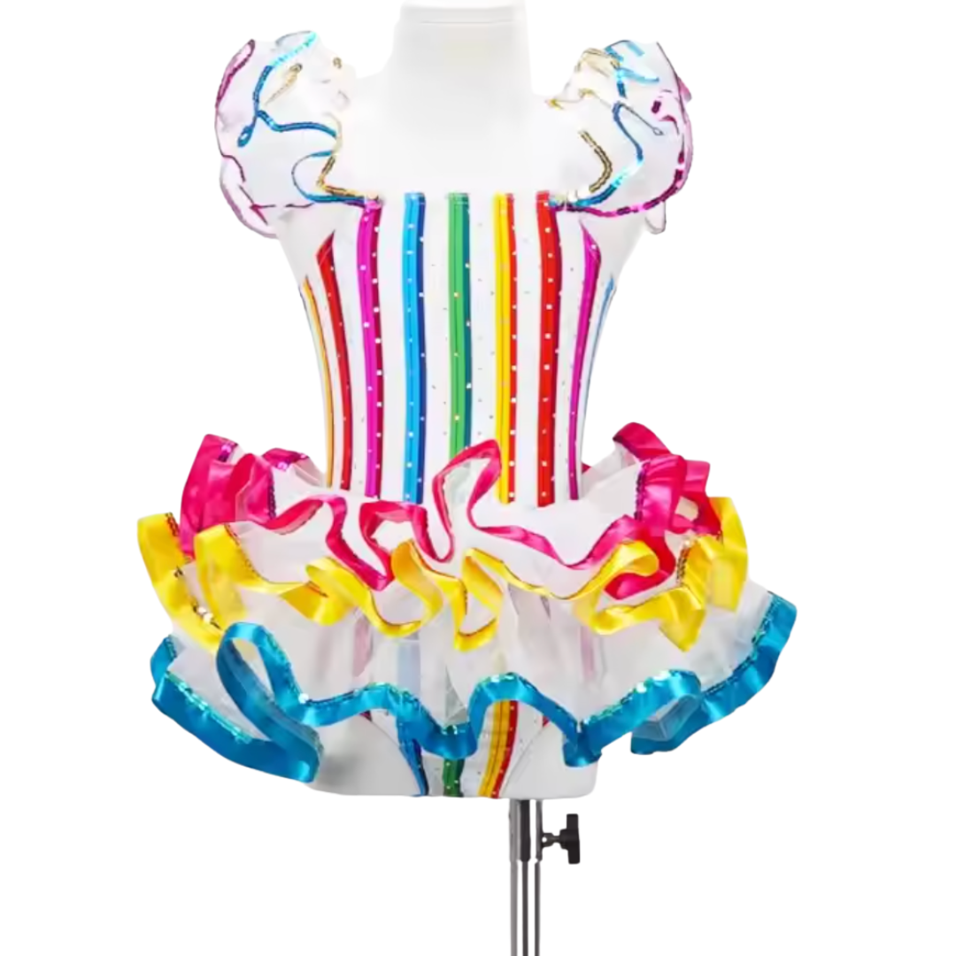 Brighten up the stage with a burst of color! The Candy Carousel is a showstopping preschool costume featuring vertical rainbow stripes, sparkling rhinestone accents, and layers of ruffled ribbon in vibrant pink, yellow, and blue. Puffy sleeves and a twirly skirt make it the perfect pick for jazz, ballet, or character pieces that call for a pop of personality.