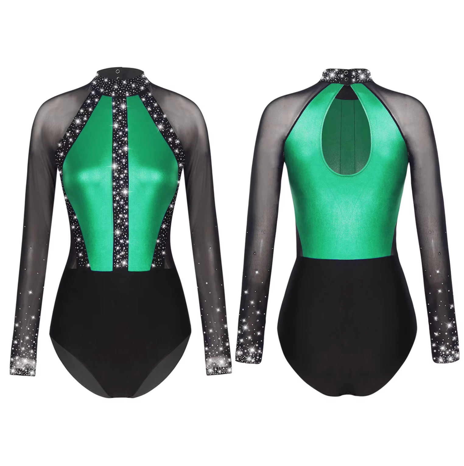 This long-sleeve leotard features a high-neck silhouette with a bold metallic panel that catches every beam of light, framed by crystal-studded mesh sleeves and neckline for that extra shimmer. The open back keyhole adds elegance and ease of movement, making it perfect for jazz, contemporary, or production routines.