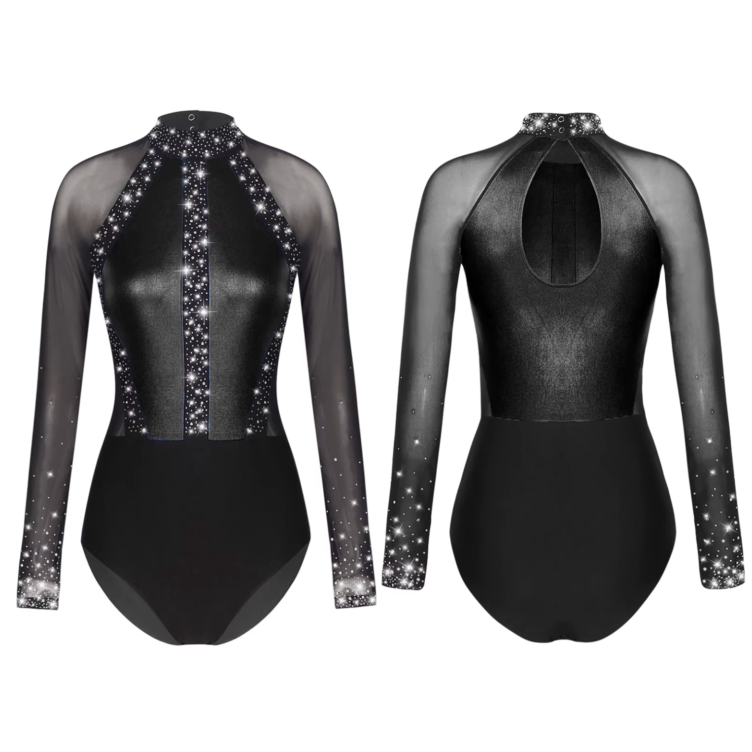 This long-sleeve leotard features a high-neck silhouette with a bold metallic panel that catches every beam of light, framed by crystal-studded mesh sleeves and neckline for that extra shimmer. The open back keyhole adds elegance and ease of movement, making it perfect for jazz, contemporary, or production routines.