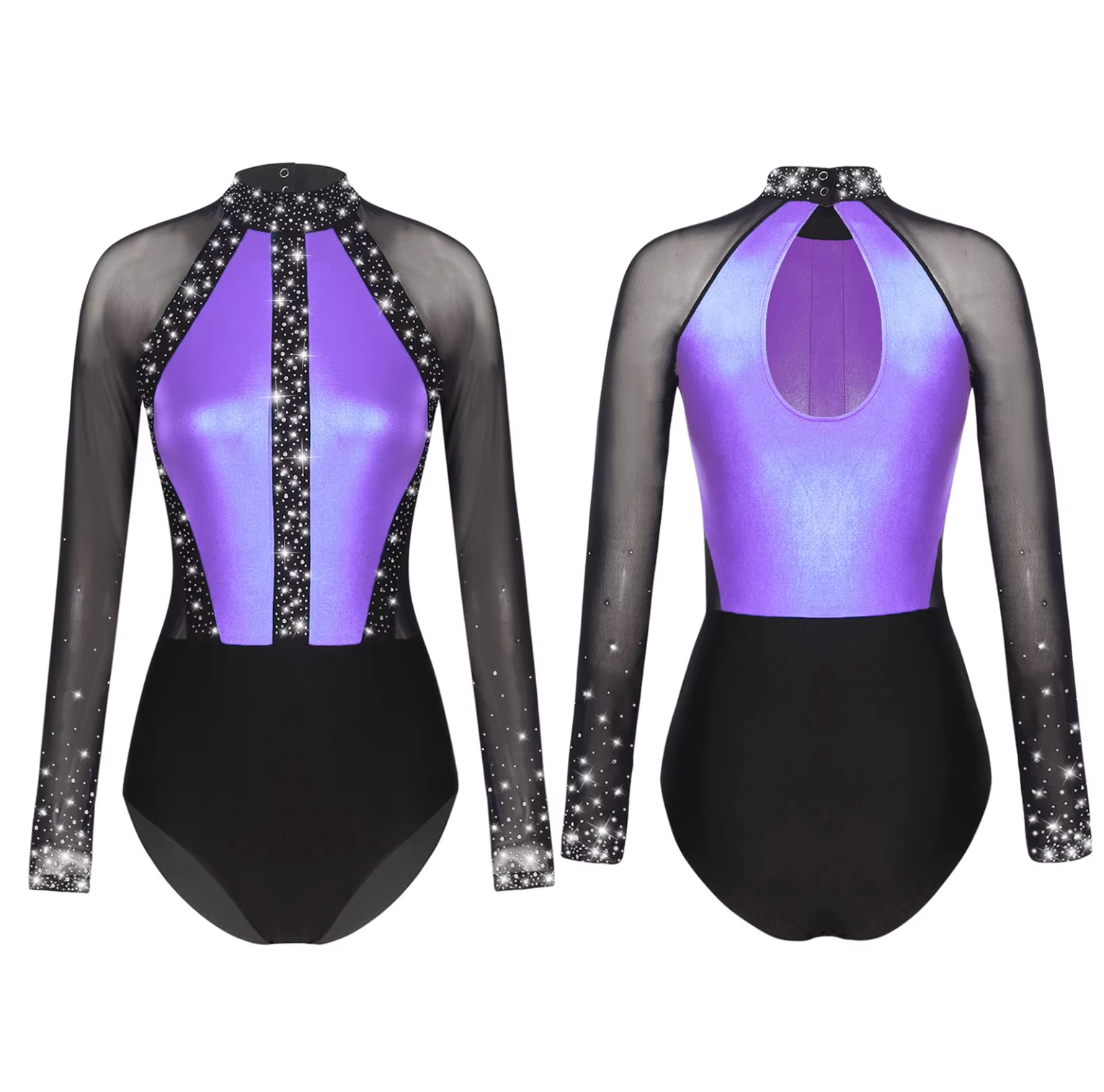 This long-sleeve leotard features a high-neck silhouette with a bold metallic panel that catches every beam of light, framed by crystal-studded mesh sleeves and neckline for that extra shimmer. The open back keyhole adds elegance and ease of movement, making it perfect for jazz, contemporary, or production routines.