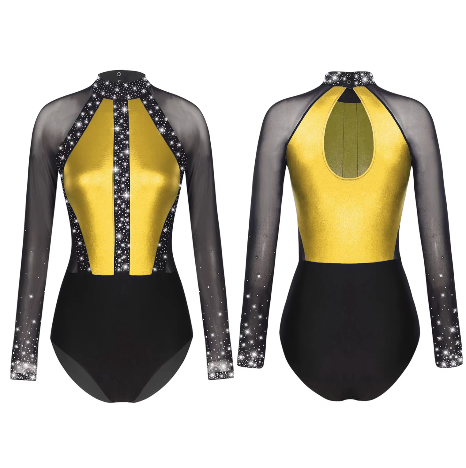 This long-sleeve leotard features a high-neck silhouette with a bold metallic panel that catches every beam of light, framed by crystal-studded mesh sleeves and neckline for that extra shimmer. The open back keyhole adds elegance and ease of movement, making it perfect for jazz, contemporary, or production routines.