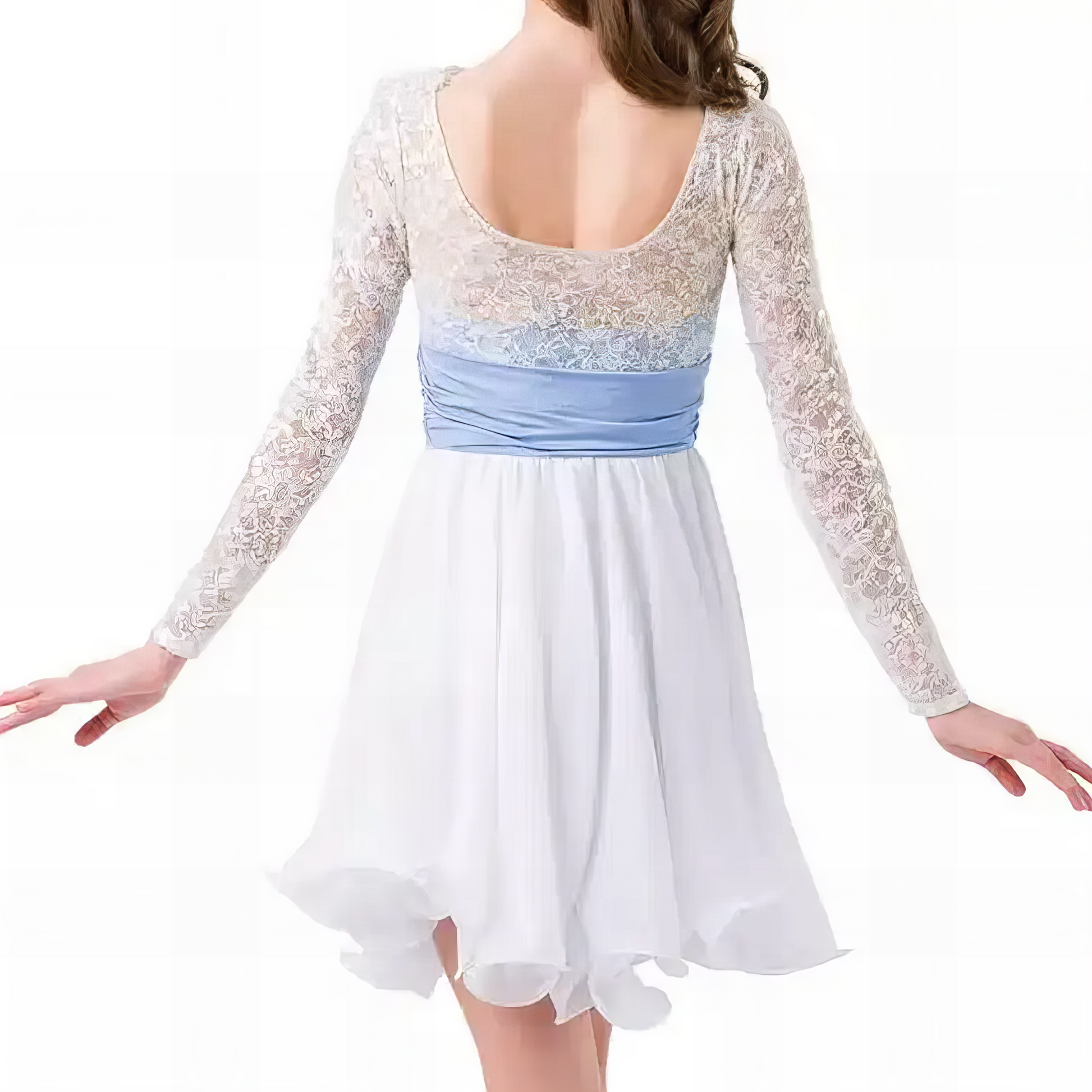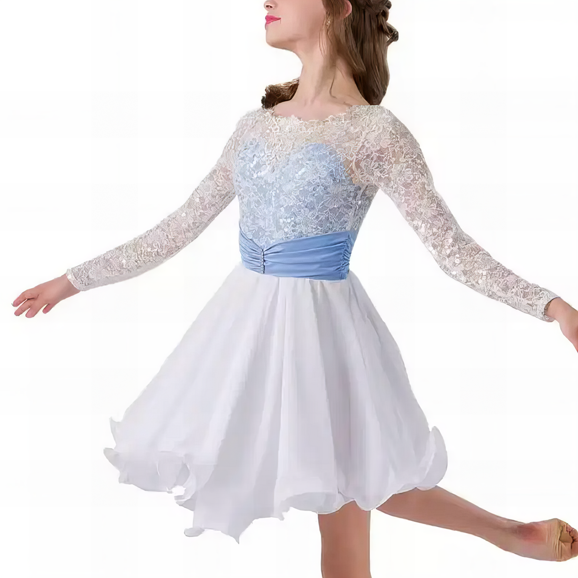 Step into a dream with Clara, a lyrical dance costume that captures the elegance of snowflakes and the grace of a winter’s breeze. Featuring a delicate floral lace bodice with full-length sleeves and a soft, flowing chiffon skirt, this piece was designed to highlight every extension and emotive moment on stage. The icy blue ruched waistband adds a serene pop of color, cinched with a subtle sparkle at the center for added refinement.