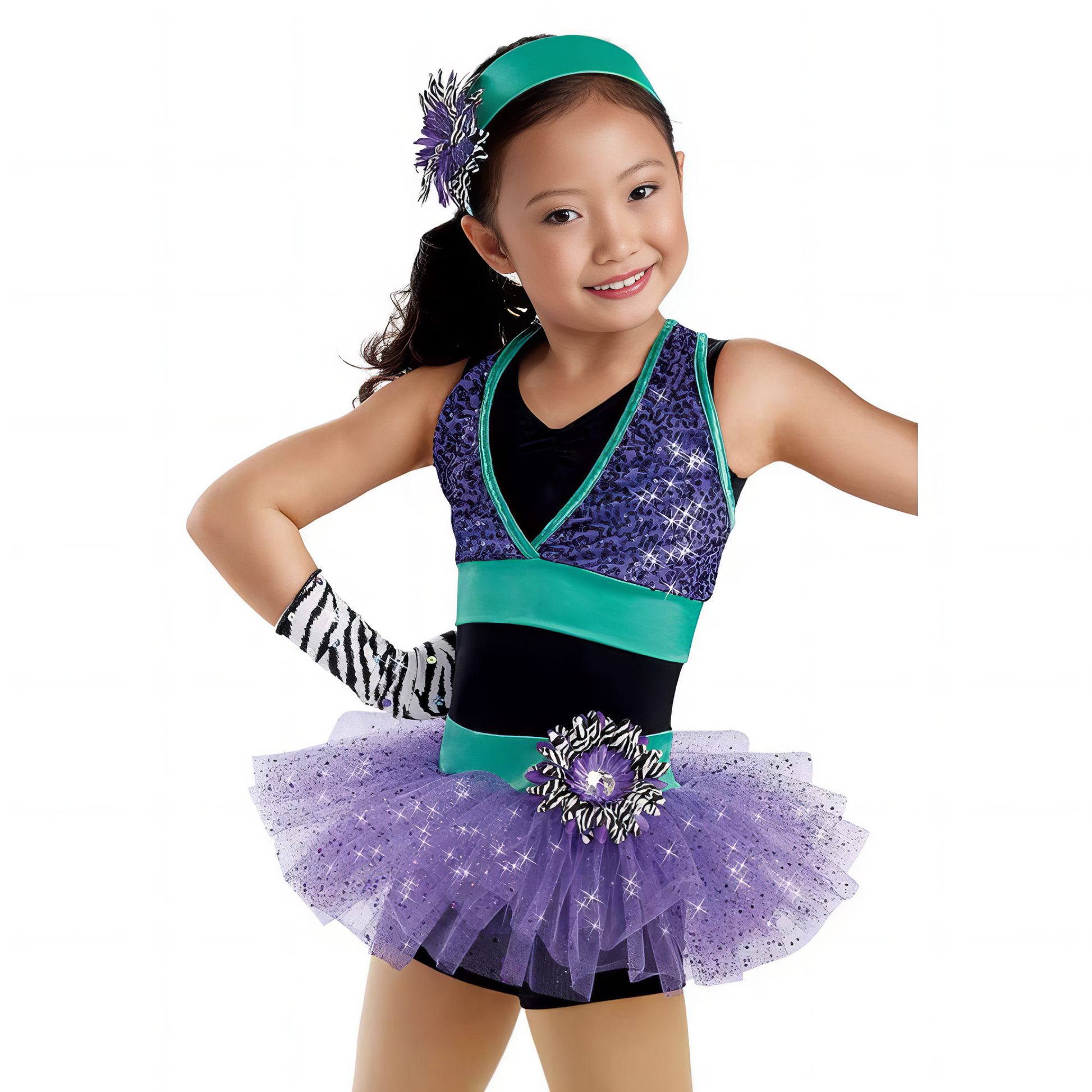 This fierce ensemble features a sparkling purple sequin bodice, accented with a teal waistband and neckline trim for a pop of fresh colour. The zebra print accessories and glitter tulle tutu add just the right amount of wild flair, making it perfect for jazz, tap, or upbeat performance routines.