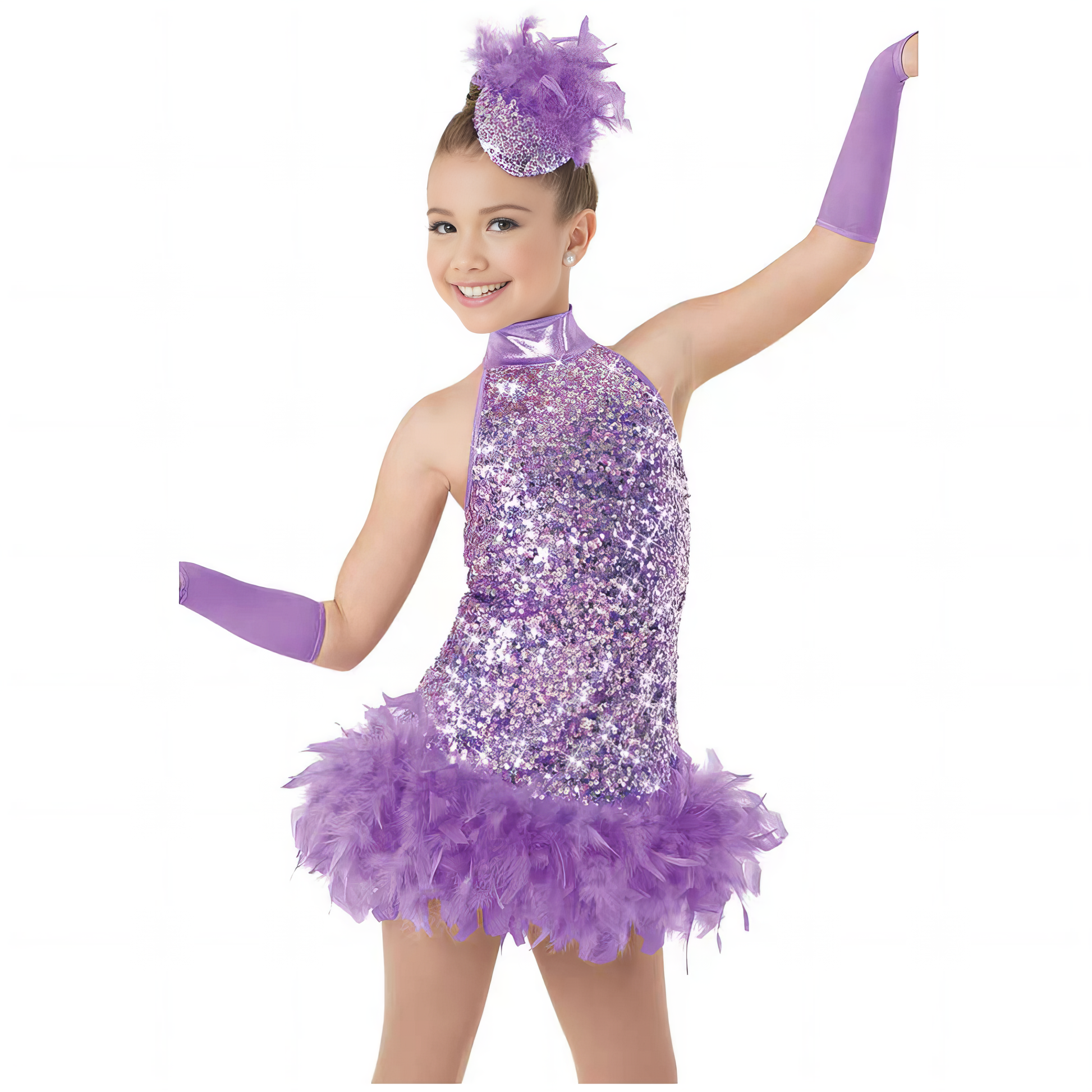 Covered in shimmering sequins from neckline to hem and trimmed with a feathered skirt edge, this dazzling design is made for jazz, tap, and musical theatre performances that deserve to shine.