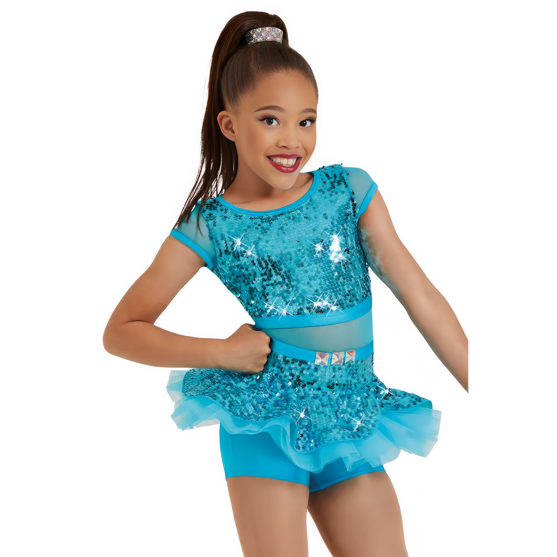 This vibrant two-piece look features a fully sequined bodice, soft mesh neckline and waistband, and a layered tulle peplum skirt that flares with every turn. The built-in shorts and crystal belt detail make it practical, secure, and full of stage presence.