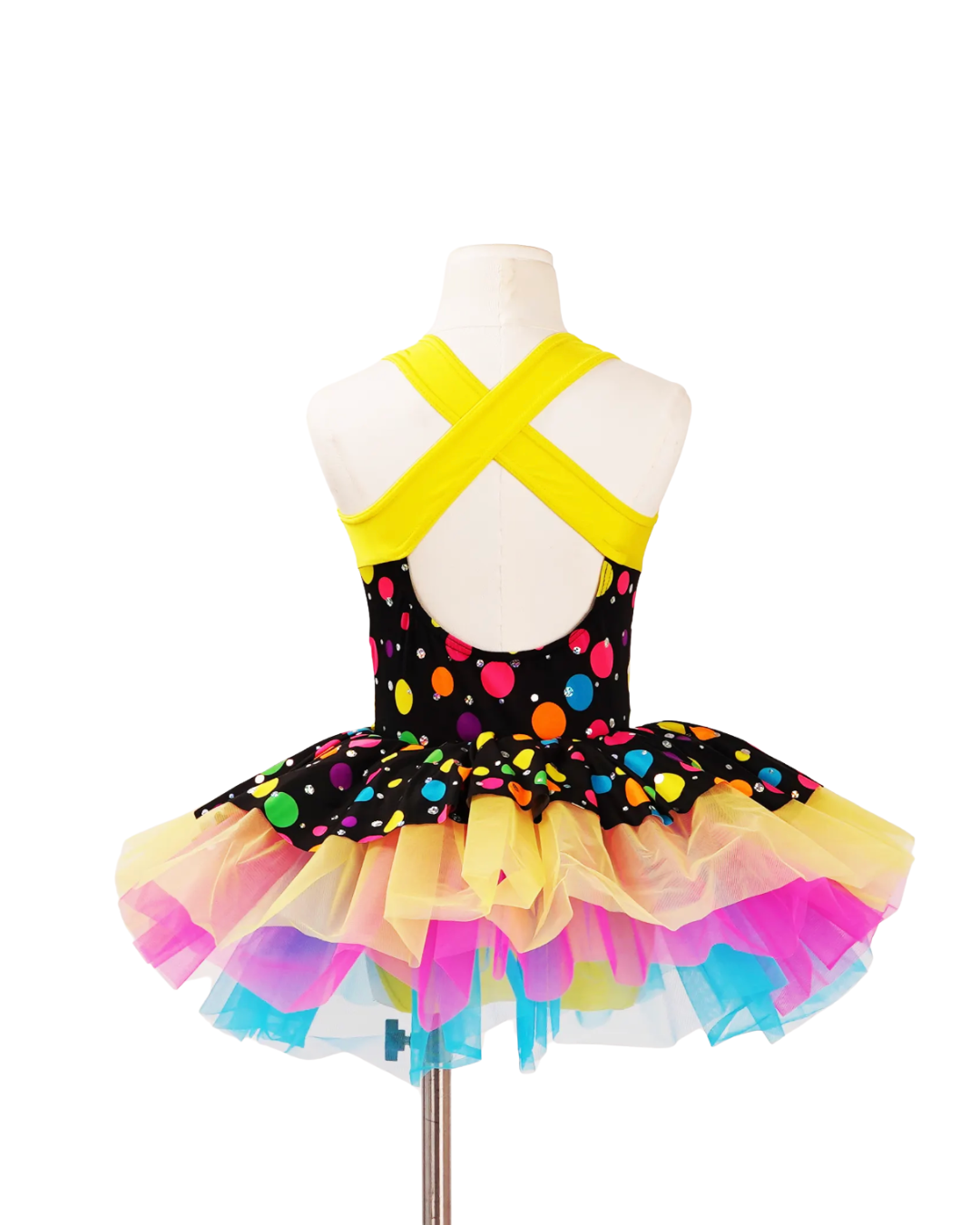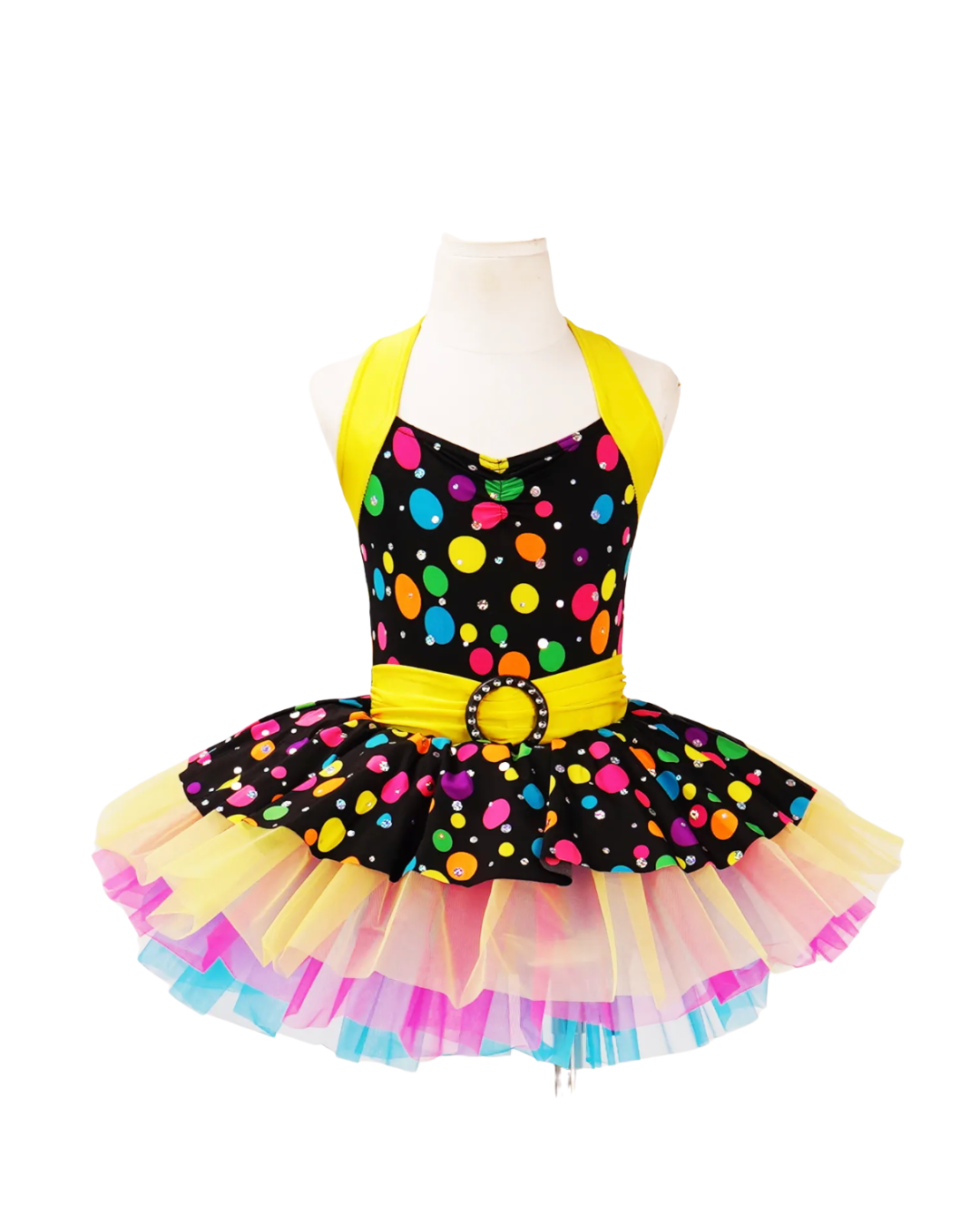Get ready to bounce, twirl, and sparkle in the Happy Dots Dance Costume — a high-energy ensemble designed to turn heads and bring the fun! With a bold polka dot print, eye-catching yellow halter straps, and a burst of rainbow tulle, this costume is perfect for jazz, tap, and upbeat group numbers.