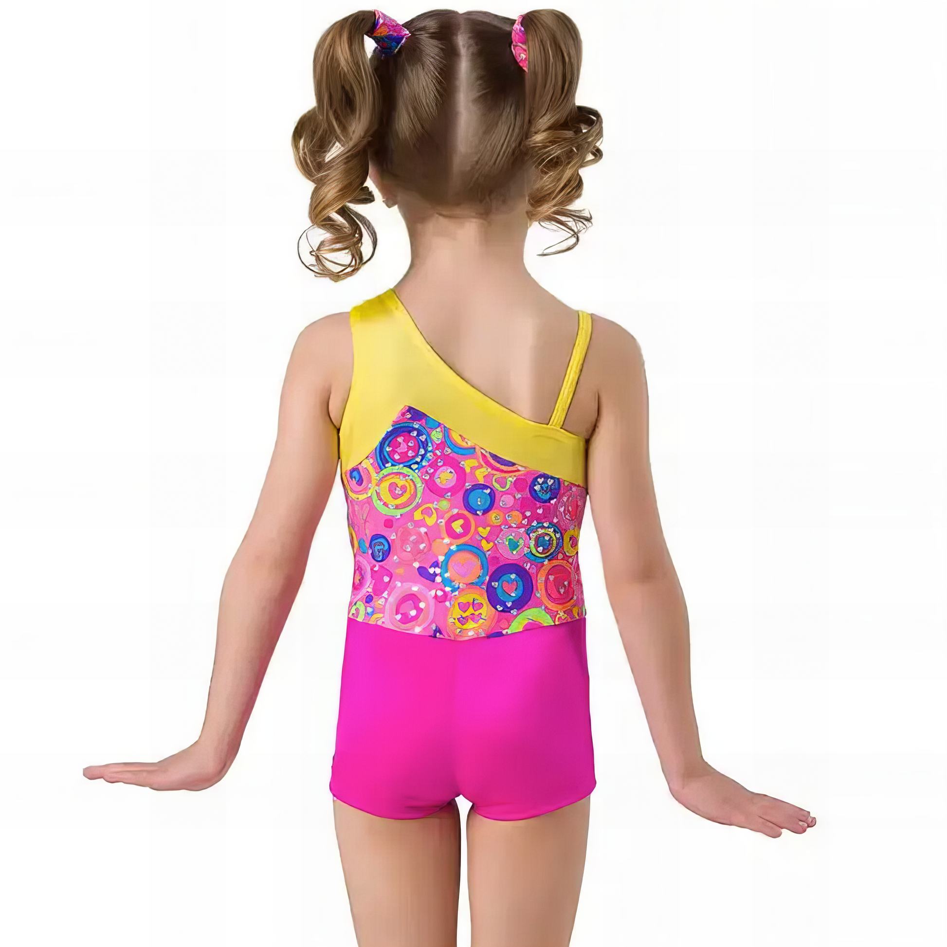 Bright, bubbly, and bursting with colour, the Jumpin' JoJo is your go-to choice for high-energy routines that sparkle with sweetness! This vibrant ensemble features a playful bodice adorned with candy-themed graphics, set against a cheerful yellow neckline and waistband. A heart-shaped rhinestone buckle at the waist adds a sprinkle of dazzle.