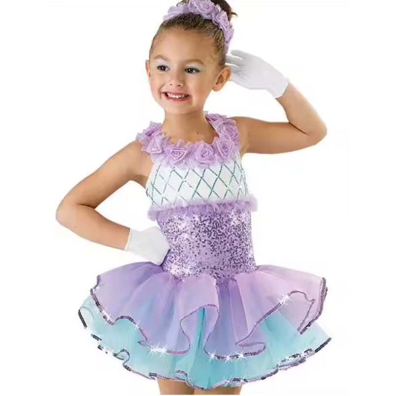 Lavender sequin bodice with a sparkly diamond overlay and floral trim neckline