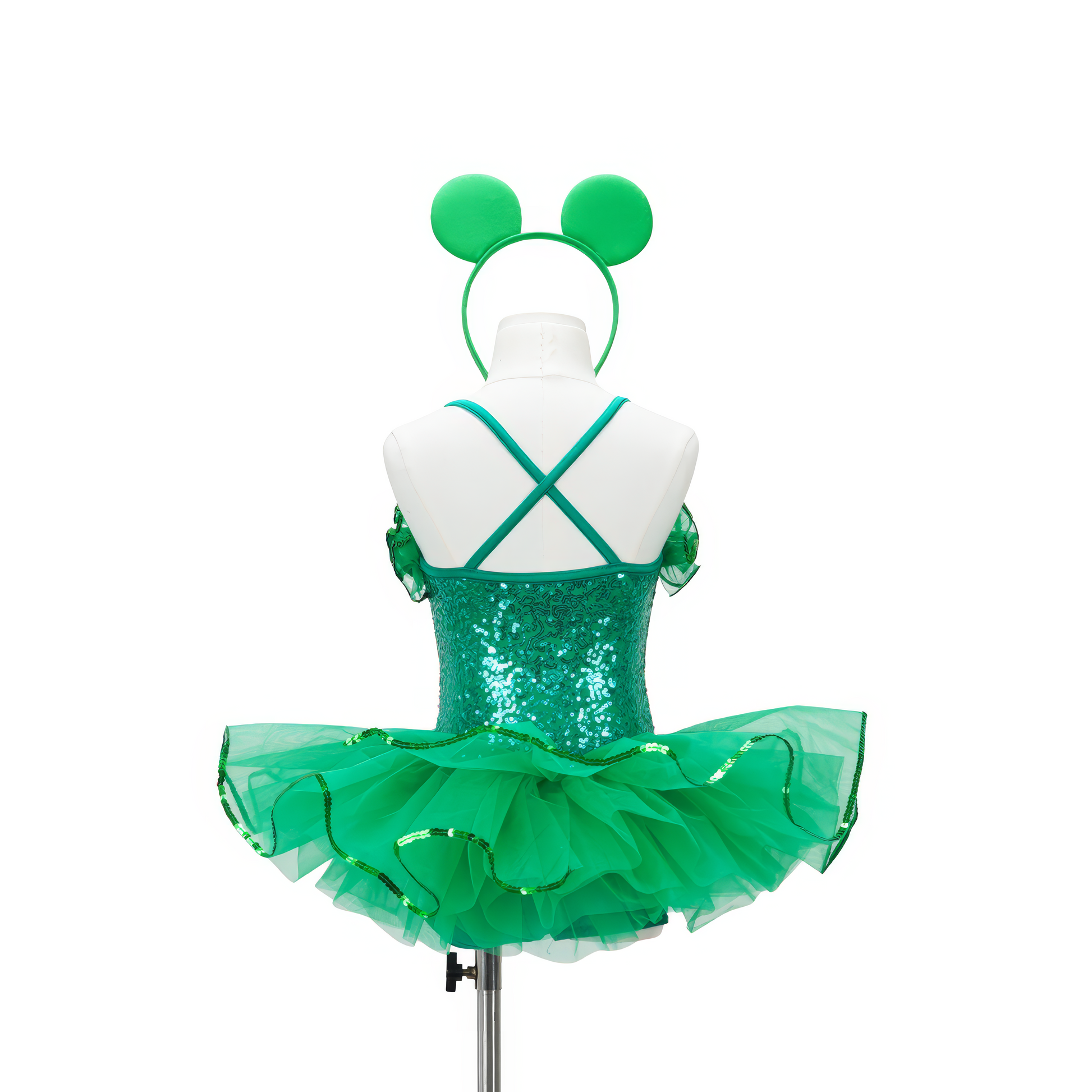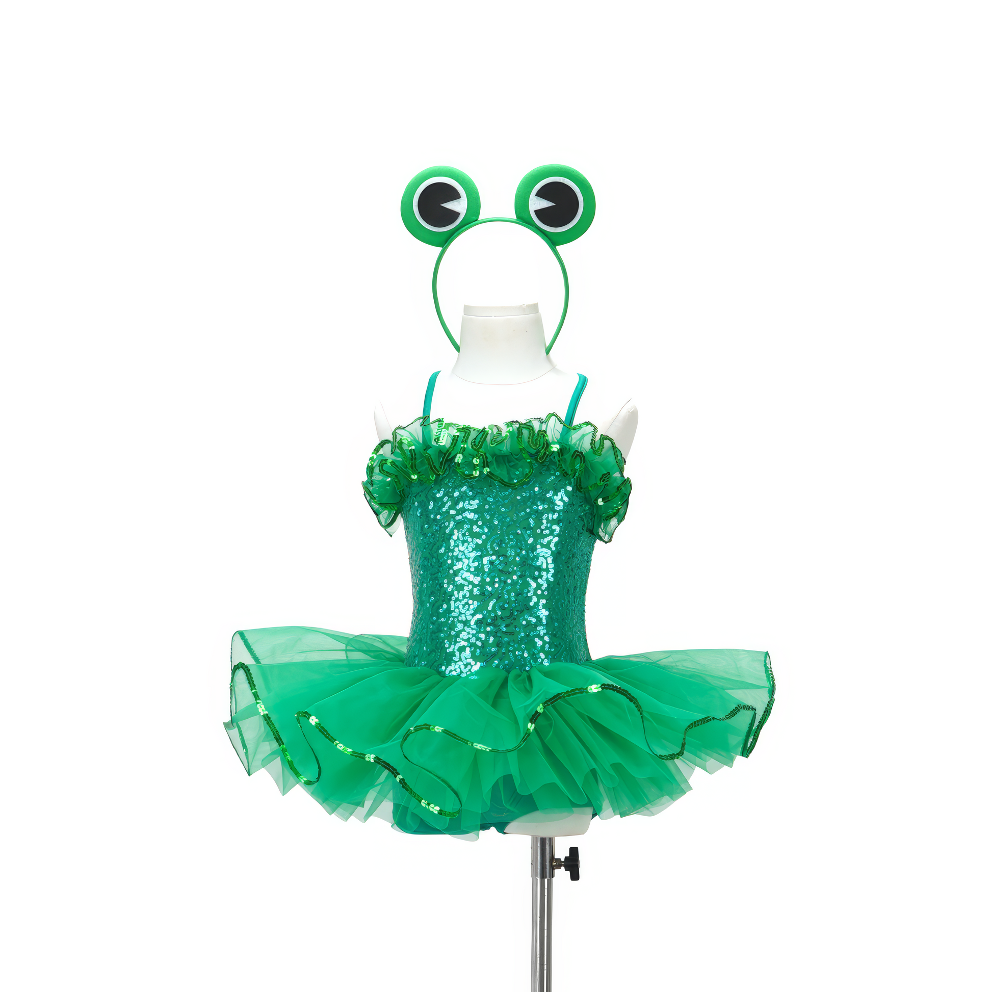 The Lily Pad Princess costume is the ultimate show-stopper for your tiny dancer. Dazzling in vibrant green sequins with a ruffled neckline and layers of sparkling tulle, this costume brings all the fun of the pond to the stage. Finished with bold frog-eye headband ears, it’s perfect for character routines, preschool ballet, or just hopping into a playful recital number.