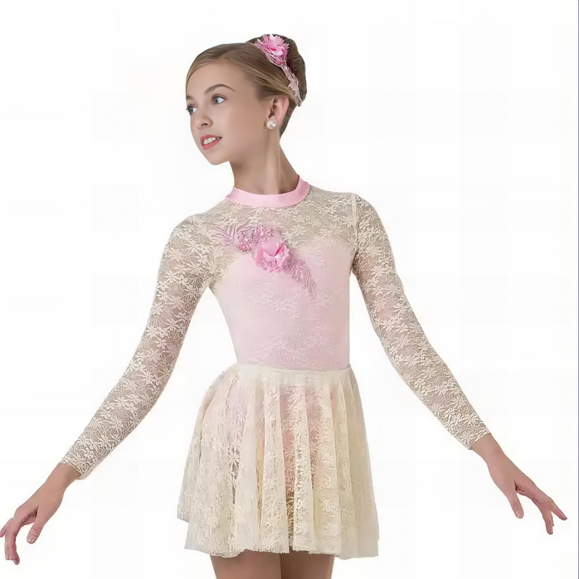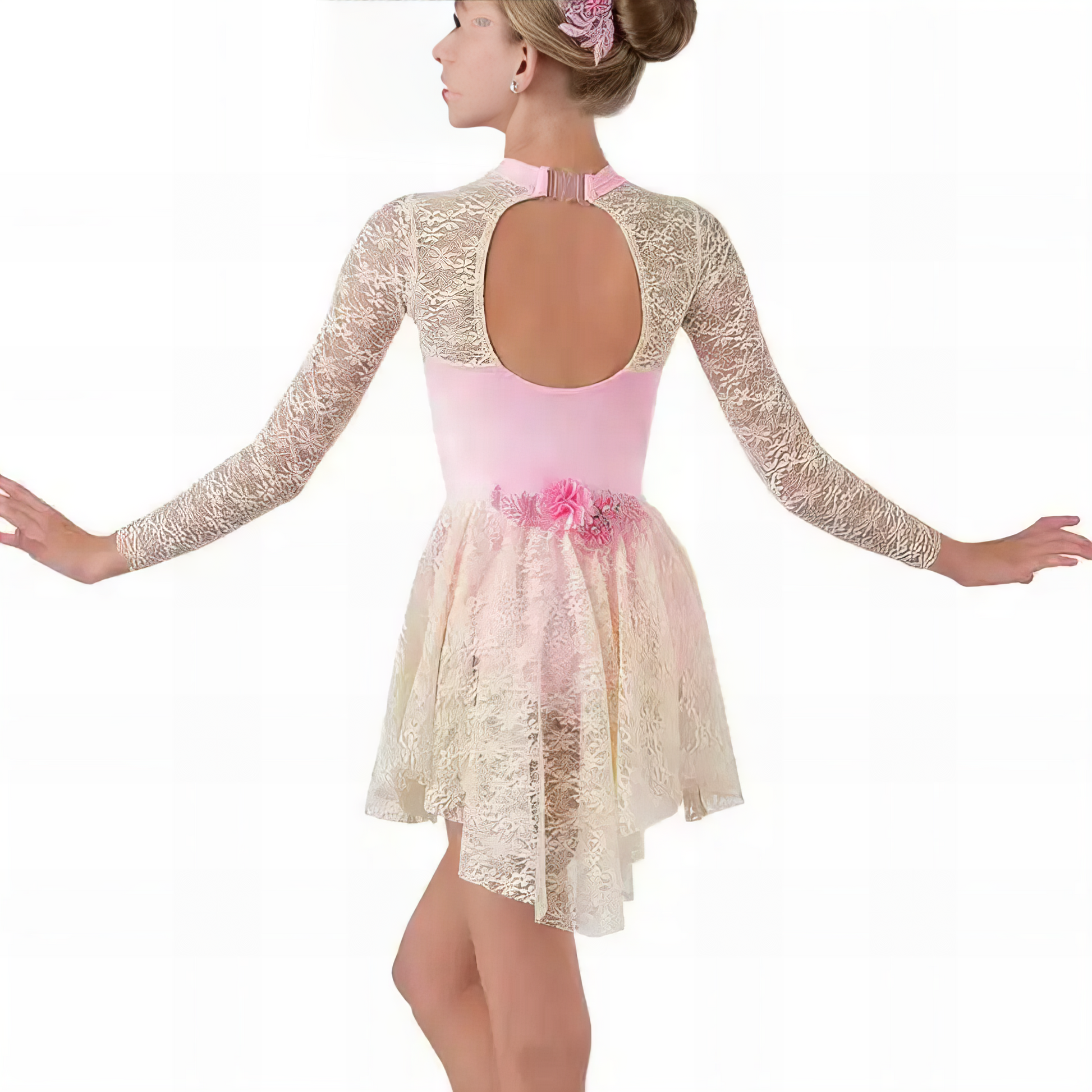 Delicate, romantic, and full of grace — the Make Me Blush costume is a lyrical dream come true. Designed for moments of storytelling and soulful movement, this costume features a sheer floral lace overlay with long sleeves, a soft ballet-pink bodice, and a flowy skirt that trails every turn with elegance.