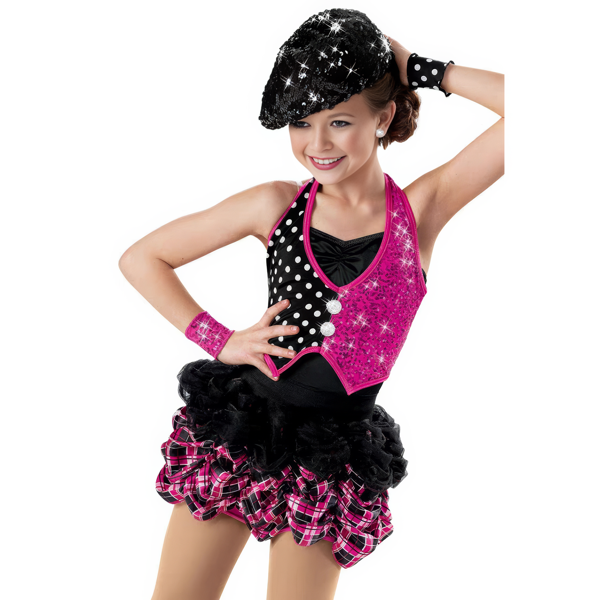 This standout look combines a hot pink sequin vest overlay with a polka dot bodice, layered plaid and tulle skirt for the ultimate jazz or tap performance outfit.