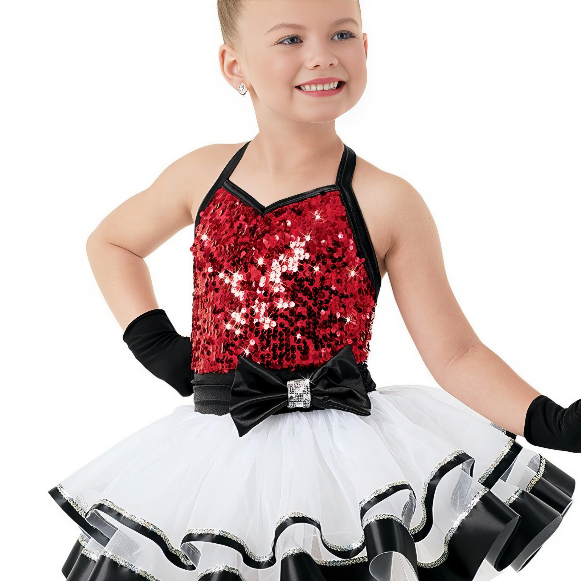 Featuring a sequin halter bodice in your choice of bold red or vibrant aqua, this glamorous look is balanced with a crisp white layered tulle skirt, black satin trim, and an eye-catching bow waistband with crystal accent.