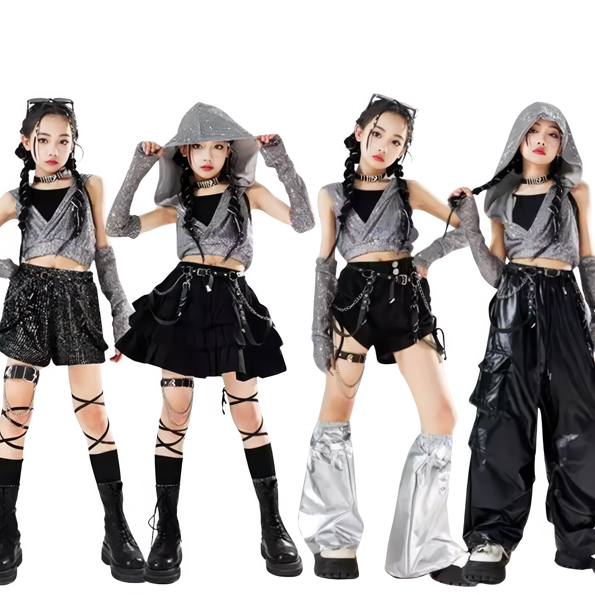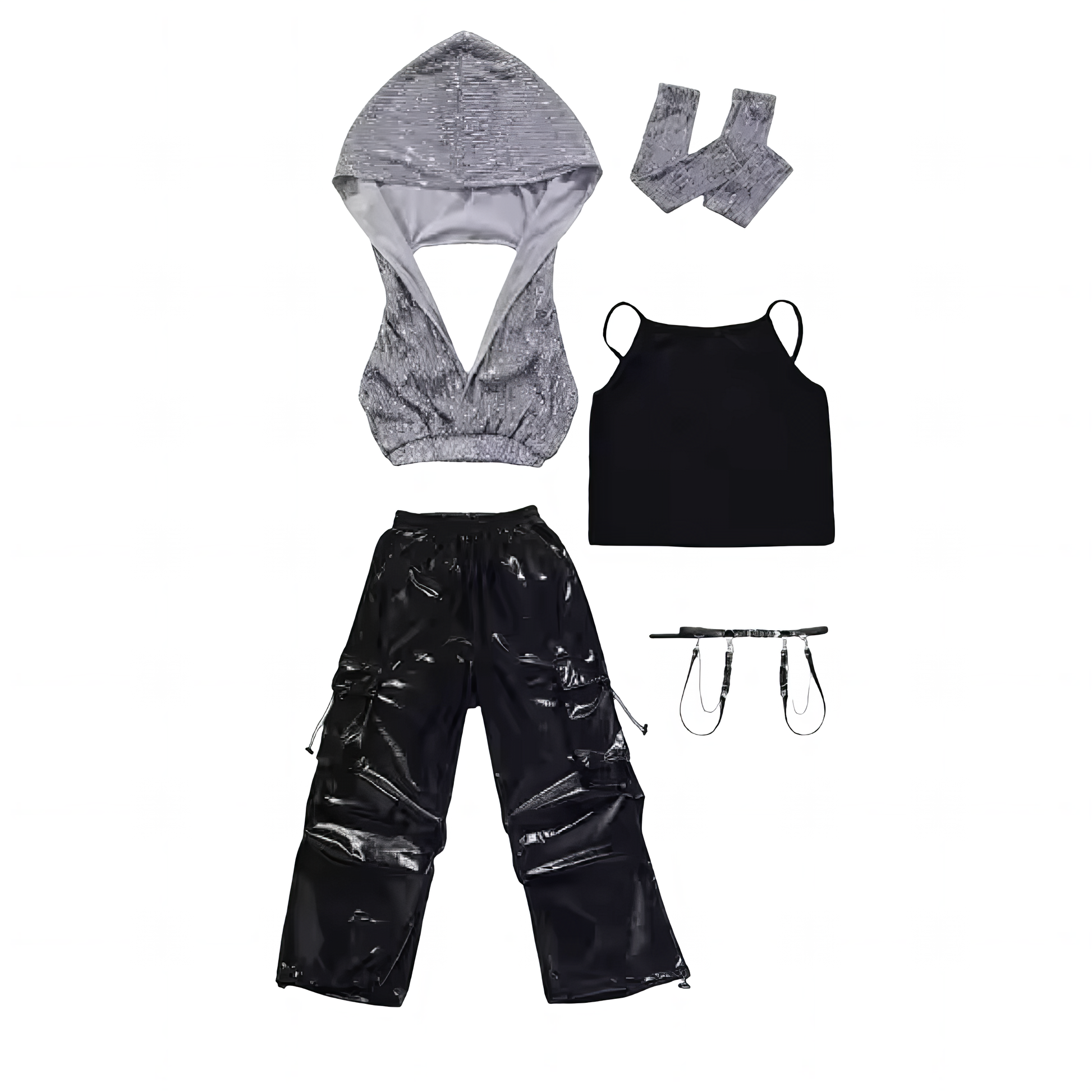 Choose from four fierce bottom styles — sequin shorts, layered mini skirt, belted hot pants, or metallic wide-leg pants — to create a custom vibe that fits your crew. Finished with chain details, harness straps, and combat-style accessories, this outfit screams confidence, attitude, and performance power.